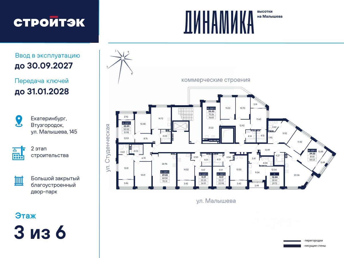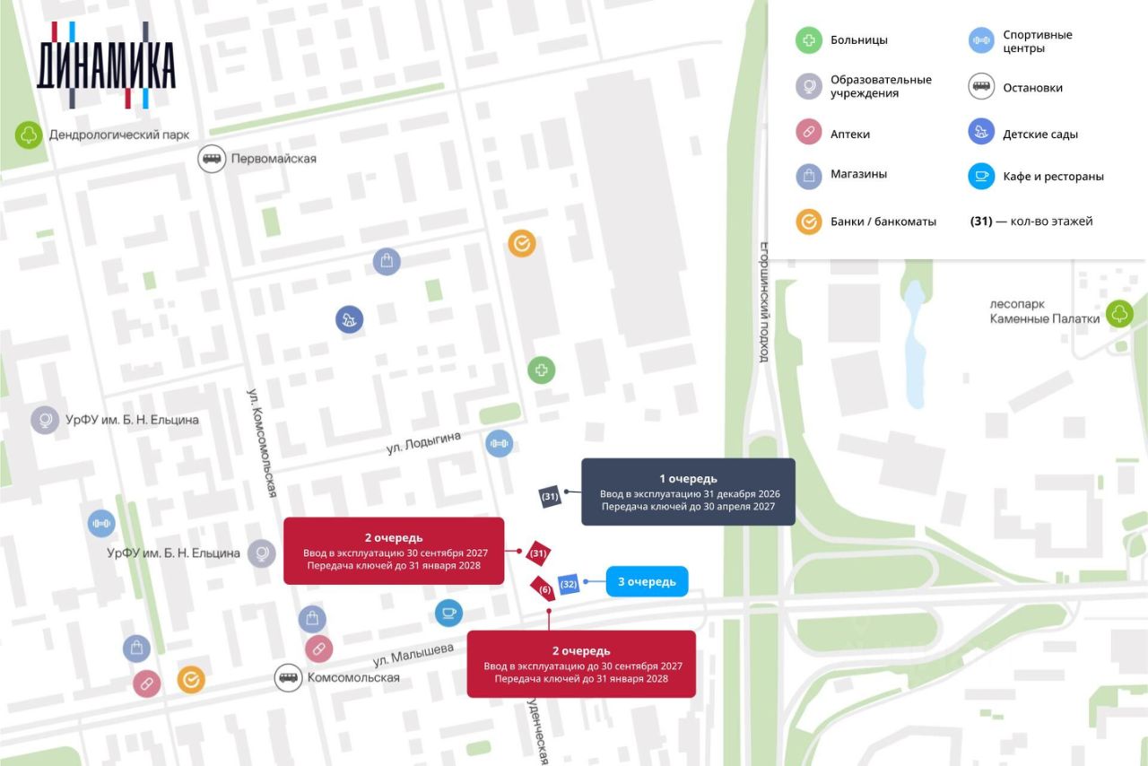 Настройте жизнь на максимум В Динамике воплощают мечты. Её фасады стремятся ввысь и рисуют силуэт ступеней — символа вашего движения, где всё задуманное сбывается. В интеллигентном микрорайоне Втузгородок всё под рукой. Пешком до остановки 5 минут, на машине до центра — 10. Соседство с торговыми комплексами и доступность ЕКАД входят в число преимуществ квартала наравне с близостью УРФУ, главных театров, филармонии, школ и детсадов. Выгляните в окно — и увидите знаменитое озеро Шарташ, которому около миллиона лет. Здесь катаются на сапах, лодках и катамаранах, а в Шарташском лесопарке вокруг озера — на велосипедах летом и лыжах зимой. Новое звучание района Выразительные башни Динамики притягивают взгляды издалека. Сплошные стеклянные витражи фасадов меняют восприятие проекта в зависимости от ракурса, времени года и суток. В квартирах с витражным остеклением алюминиевые оконные рамы и широкие подоконники визуально увеличивают пространство. Благодаря современным технологиям витражи обеспечивают дополнительную теплоизоляцию, помогая сохранять комфортный микроклимат в квартире и летом, и зимой. Отдых в вашем ритме Выбирайте досуг по душе для себя и семьи. Занимайтесь на тренажёрах и воркаут-комплексе, играйте в пинг-понг, футбол или баскетбол. А детей предоставьте насыщенному плейхабу, который тренирует тактильность и равновесие в атмосфере безопасности и контролируемого риска. Размеренно прогуливайтесь меж декоративных холмов, под тенистыми навесами-перголами вблизи удобных скамеек, многолетних трав и разновысотной уличной мебели. СТРОЙТЭК возводит Динамику в 3 этапа. Второй этап строительства В нём 2 секции. С2 — престижная высотка в 31 этаж. Здесь 209 квартир от 1- до 3-комнатных и 19 уникальных планировок с просторными кухнями-гостиными до 21 м квадратного. Кроме того, закрытый паркинг на 31 место и 40 кладовых-келлеров внутри стилобата. В подъезде С2 — светлый холл с минималистичным дизайном бизнес-класса, помещения для колясок и самокатов, а также 3 надёжных лифта на 1 000 кг каждый. С4 — парадный 6-этажный дом с элегантной смещённой геометрией и полным витражным остеклением всех 5 жилых этажей. Внизу расположено впечатляющее лобби с лаунж-зоной и стойкой ресепшен, атмосферная уличная площадь для встреч и торговая галерея. В секции всего 34 квартиры в 16 уникальных планировках от студий до 3-комнатных. Это особый уровень респектабельной и неторопливой жизни. Технологии комфорта Обратите внимание на специальные форматы планировок с гардеробными и тёплыми лоджиями. Отдельно в С4 — на видовые квартиры с террасами на 5 и 6 этажах, а также лоты с мастер-спальнями, где у приватного пространства для отдыха своя ванная. Что касается отделки — в Динамике улучшенный стандарт ''Комфорт+''. Помимо привычных комфортных сантехники и электрики, в него входят оконные стёкла Energy Light, приточные клапаны вентиляции Air-Box, особо прочный ламинат 33 класса и устойчивые к многократной покраске виниловые обои. Белые межкомнатные двери и плинтусы лаконично подчеркну