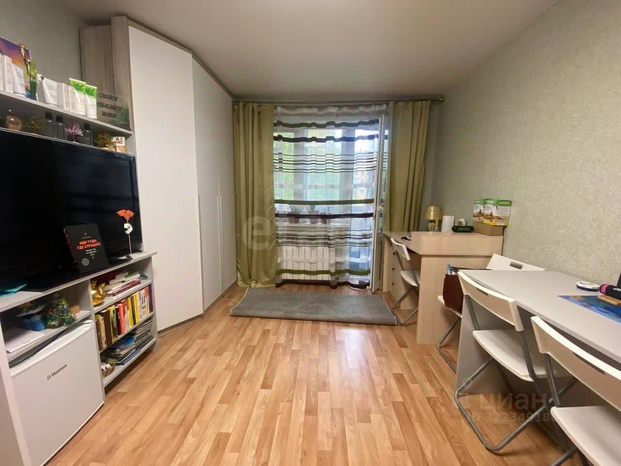 В марте в квартире сделан косметический ремонт - на стенах обои, на полу линолеум, потолок натяжной. В сан узле уложена плитка. Есть застеклённый балкон с пластиковыми окнами.