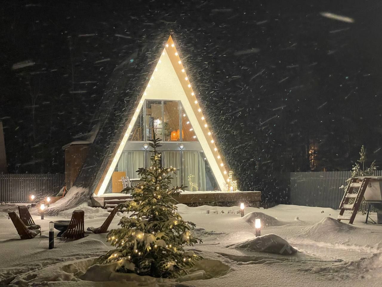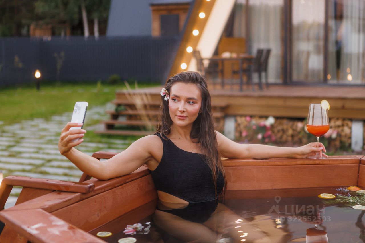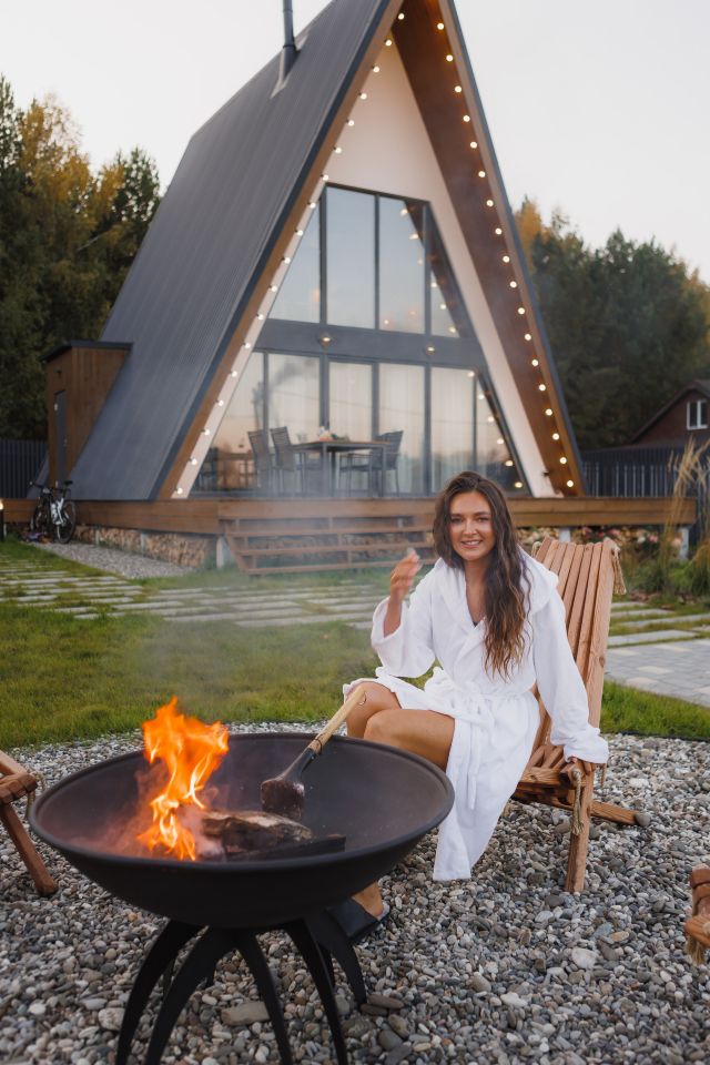 Треугольный дом в аренду расположен на красиво оформленном участке, изюминка которого - банный чан. Парение в нём лёгкое и комфортное. Можно добавить в воду полезные травы и масла, взять с собой еду, напитки и сполна насладиться отдыхом на природе. Ну, а в зимнее время чан - совершенно особенное удовольствие!