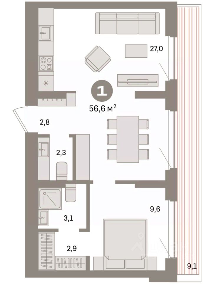 Квартира с кухней-гостиной и одной спальней в квартале ''Депо''. Особенности планировки: гардеробная, предчистовая отделка, мастер-спальня, терраса на крыше. квартиры в нашей базе: ДЕП07-Ж3.7.5.