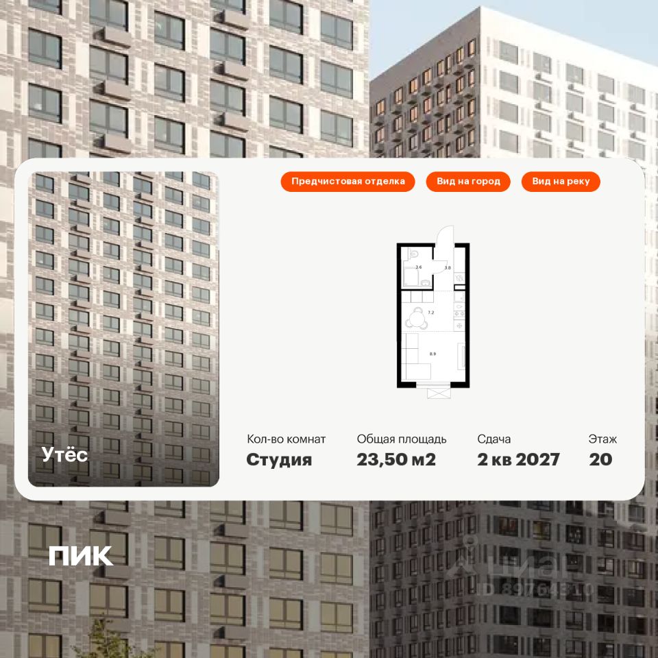 Продаётся квартира-студия площадью 23,5 кв.м на 20 этаже 29 этажного дома (Корпус 6, Секция 1) проекта ПИК Утёс. Светлый просторный подъезд на уровне земли, функциональная планировка, большие окна, предчистовая отделка.