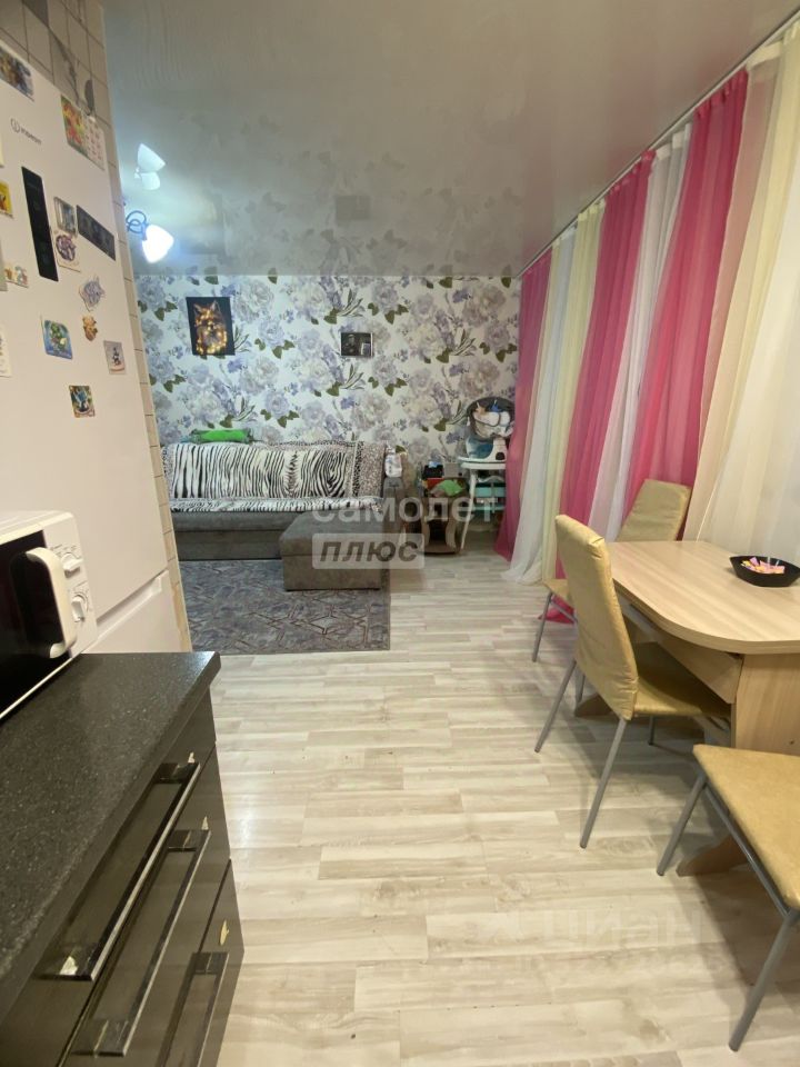 Кухонная зона совмещена с большой комнатой, санузел совмещён, пол в плитке, стены требуют небольшого косметического обновления.