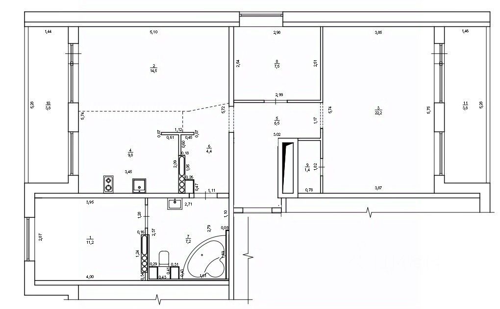 Объект расположен в доме улучшенной планировки, год постройки 1995, по адресу ул. 8 Марта, д. 181к2. Планировка нестандартная, но при этом очень функциональная. Площадь квартиры по документам - 83,6 кв.м., без учета 2 лоджий по 4 кв.м. каждая, и увеличенного коридора на 3 кв.м. На данный момент: три изолированных комнаты и объединенная кухня с гостиной, площадью 25 кв.м. Одну из комнат, площадью 22 кв.м. с двумя окнами можно при необходимости разделить на две отдельных комнаты.