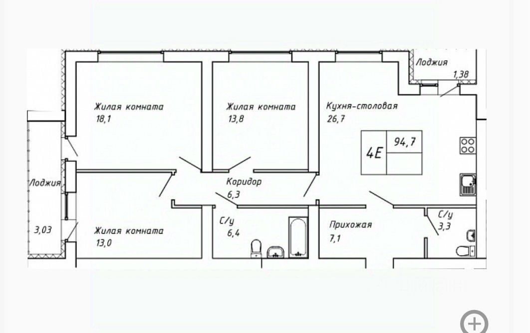 Общая площадь 94 кв/м. Две застекленные лоджии, два сан.узла, кухня + гостиная и три изолированные друг от друга комнаты.