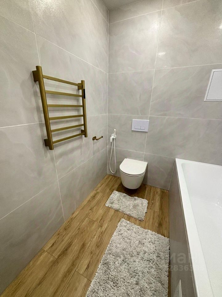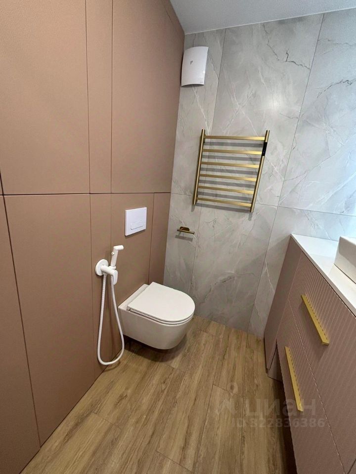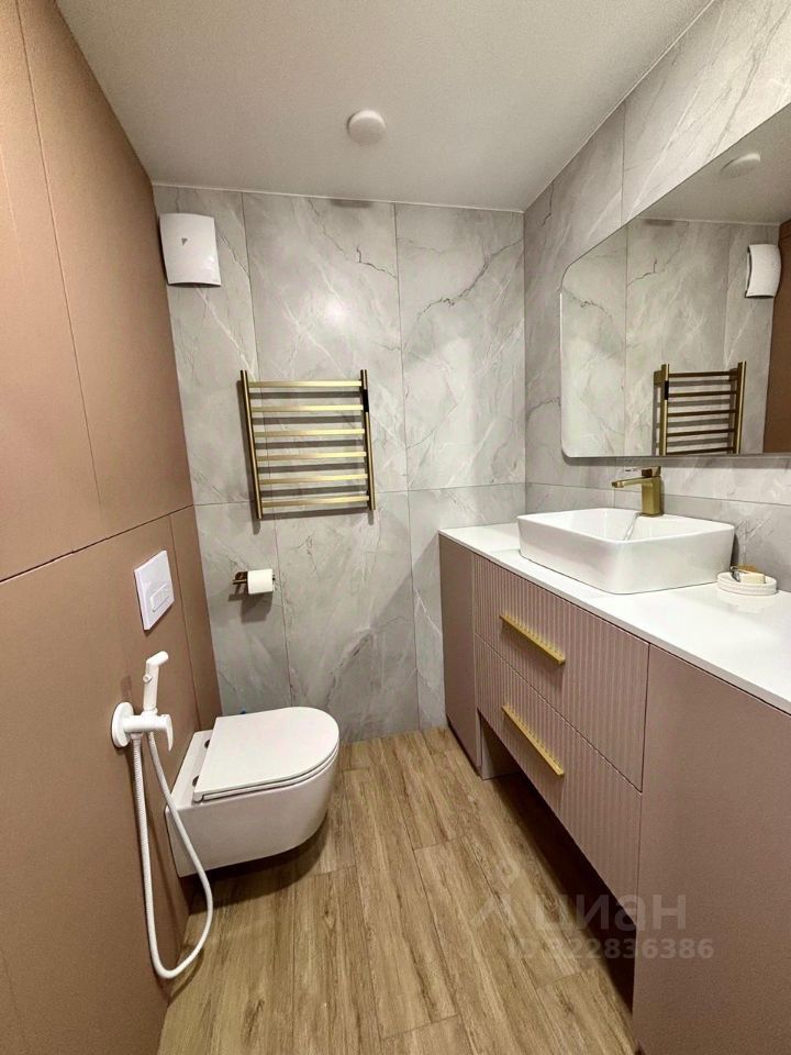 Гостевой сан.узел (3,1 кВ/м) — пол и стены керамогранит, установлена инсталляция, гигиенический душ, электрическая сушилка для полотенец, натяжной потолок, зеркало с подсветкой, золотая фурнитура/сан.техника, встроенный шкаф-купе.