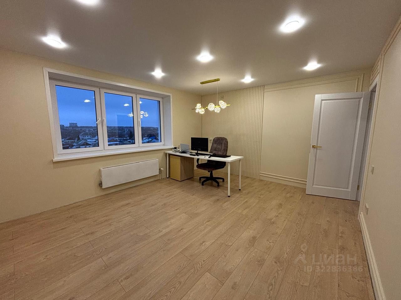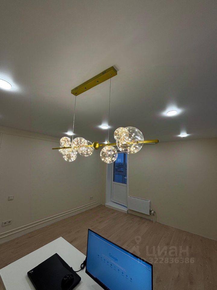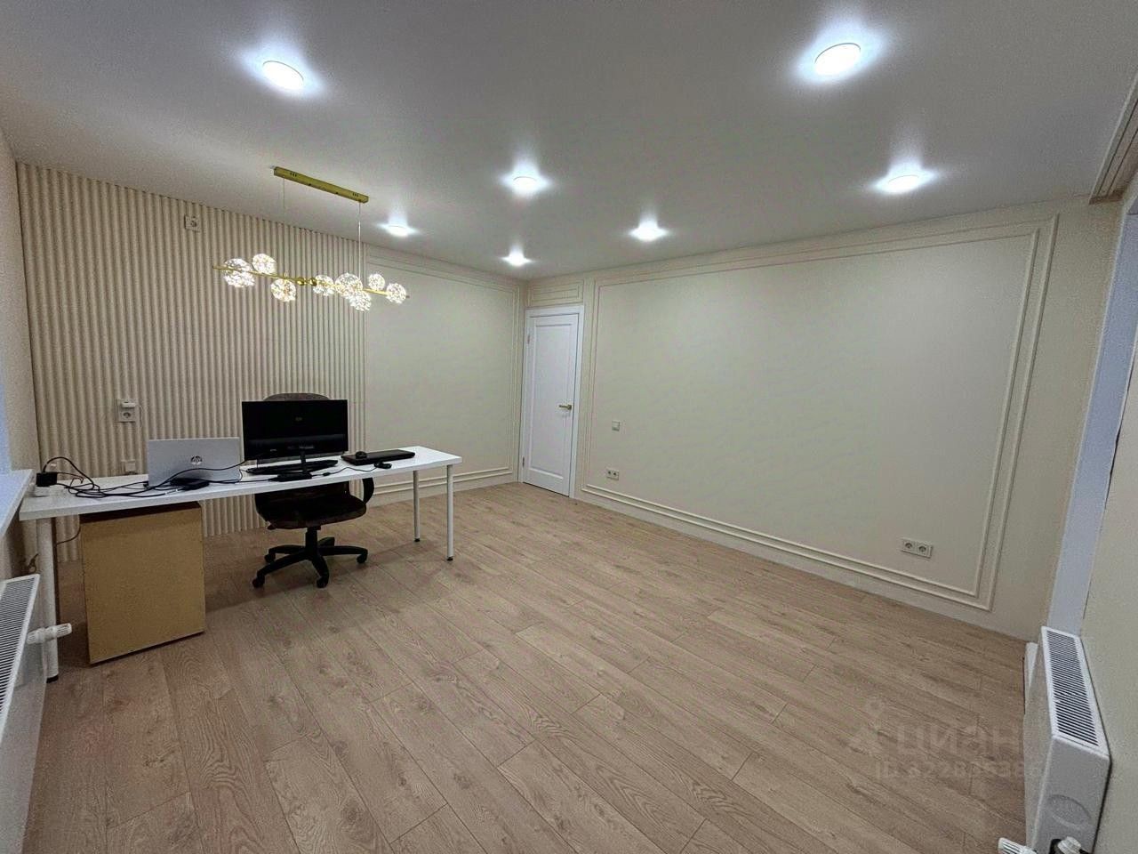 Кабинет (18,1 кВ/м) — ламинат, натяжной потолок, стены под покраску с дизайнерским оформлением, дизайнерская люстра, выход на вторую лоджию.
