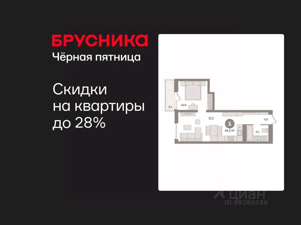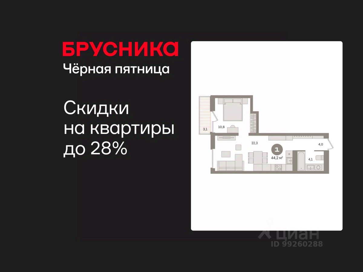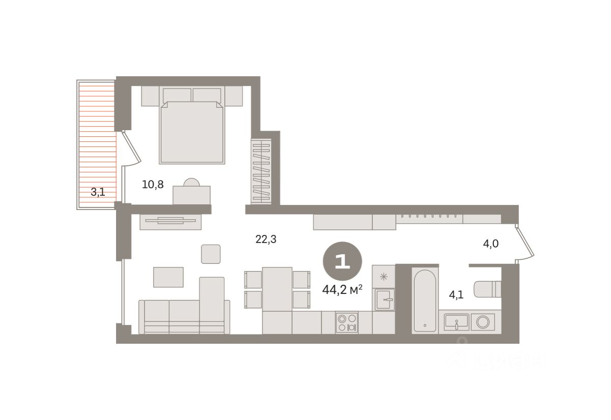Квартира с кухней-гостиной и одной спальней в Северном квартале. Особенности планировки: вид во двор, предчистовая отделка, балкон. квартиры в нашей базе: СКВ04.2-Ж1.4.8.