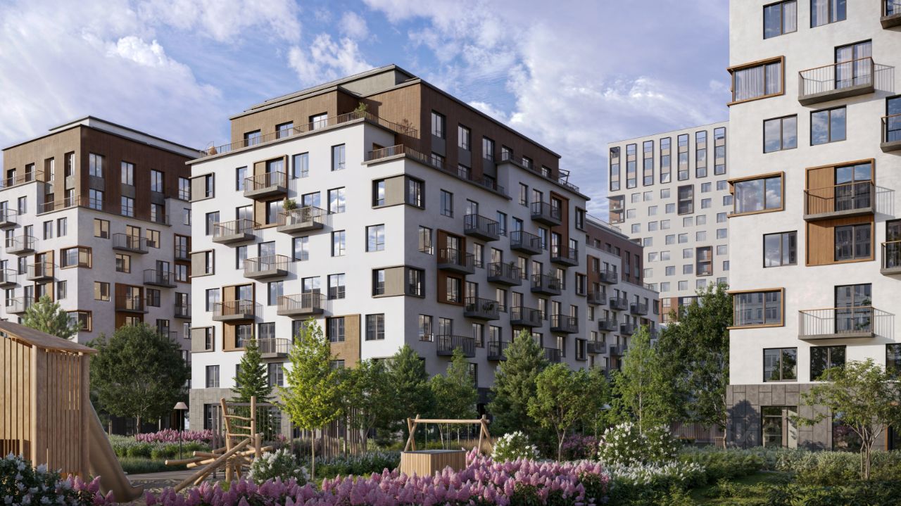 Оживлённое уличное движение останется за пределами квартала, а внутри создается собственная природная среда с зонами для вечерних прогулок, расслабленного отдыха, спорта и игр. Между домов проходит широкий пешеходный бульвар с разнообразным ландшафтом. Он объединяет общественные пространства между кварталами и переходит в площадь-сквер с фонтаном.