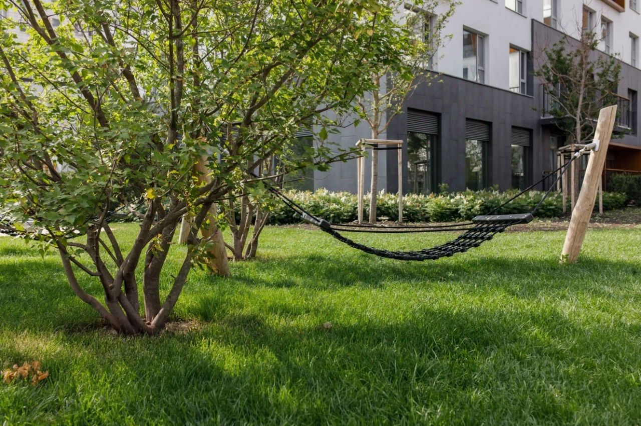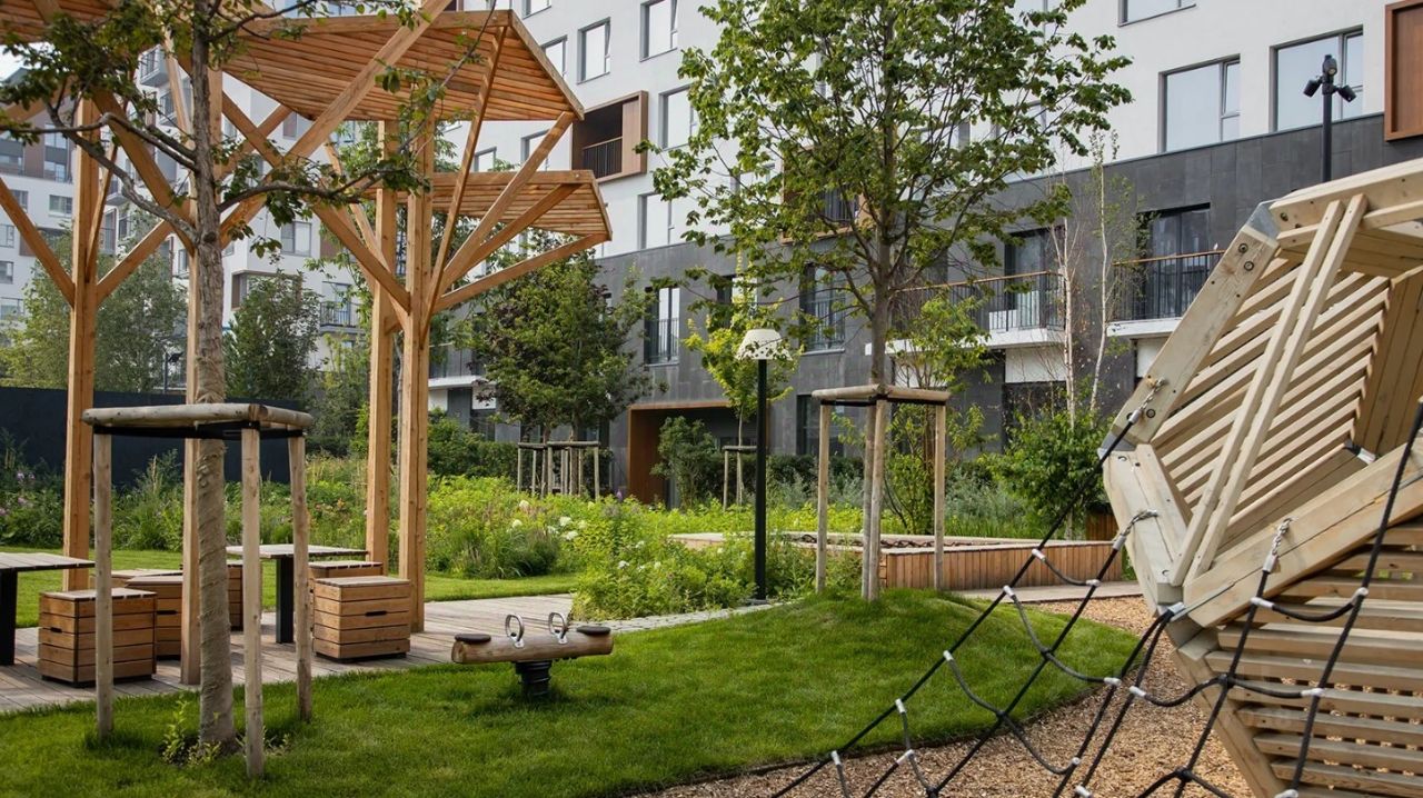 Проект благоустройства связывает приватные дворы кварталов, парковое пространство вокруг урбан-вилл, игровые комплексы для детей разных возрастов и спортивные площадки в единый ландшафт. Внутриквартальный двор тихий и спокойный. За счёт разной этажности и арок во дворе — много света. Здесь будет высажено до 40 видов растений — деревья, кустарники, цветы, злаковые травы и газон. Деревья привезут уже взрослыми со сформированной кроной. Растения цветут в разное время года, имеют разную плотность и высоту. Всё это сделано для того, чтобы двор был разнообразным и в каждое время года имел свой цвет. #2M27e8