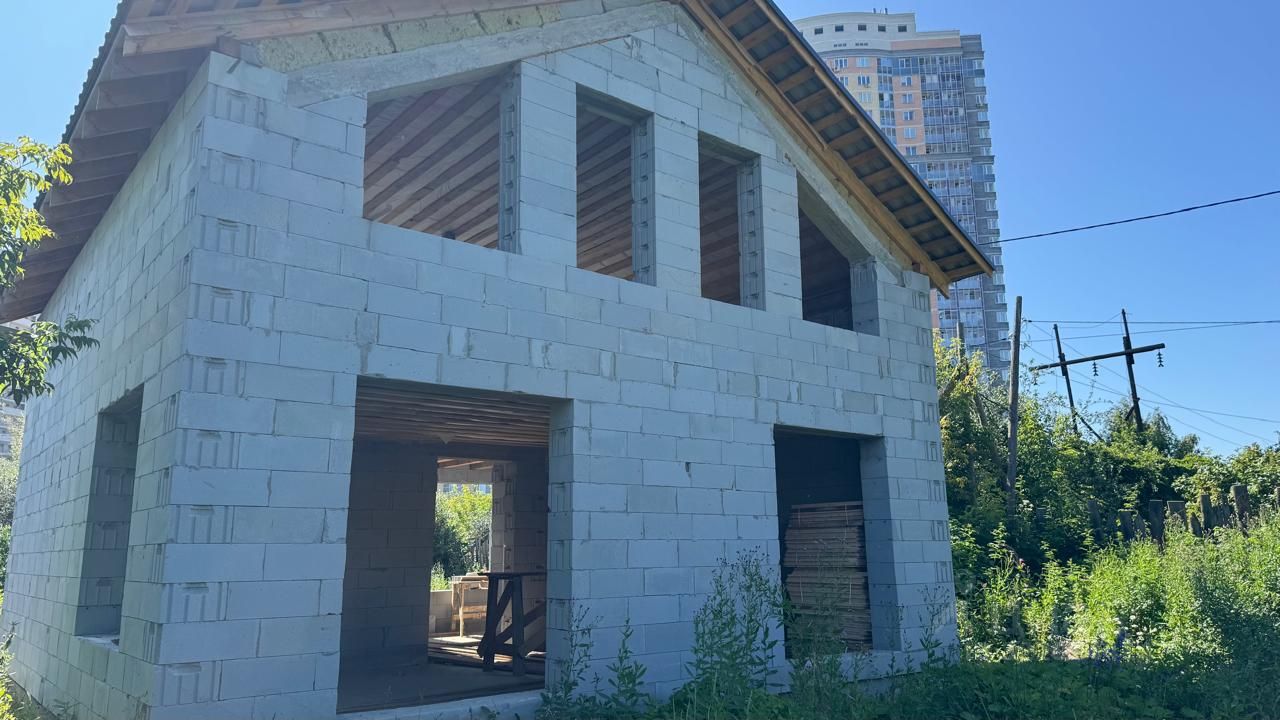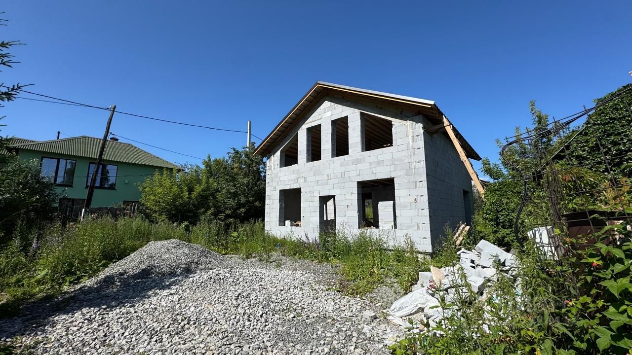 Возведена коробка дома, под крышу. Материал стен - Твинблок толщиной 400 мм. Фундамент - плита. Строили для себя, с соблюдением всех стандартов. На участке есть фундамент для бани. Участок правильной формы. Дом зарегистрирован.
