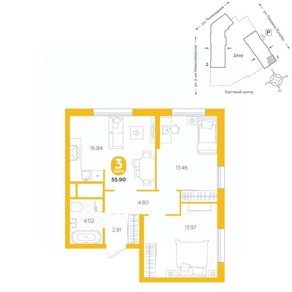 Квартира находится в ЖК ''Бодровский'' от федерального застройщика ''Паритет Девелопмент''. Это жилой комплекс комфорт-класса с современной архитектурой, расположенный в Екатеринбурге в районе улиц Патриса Лумумбы и 2-й Новосибирской. Добраться от него до центра города можно всего за 25 минут, дорога до ЕКАДа займет 12 минут. В окружении жилого комплекса есть шесть детских садов, пять школ, три больших парка, пять спорткомплексов, в том числе курортный комплекс Уктус. Квартал состоит из двух секций переменной этажности (от 14 до 24 этажей) и подземного паркинга с кладовыми, к которым можно будет спуститься на лифте. На первых этажах предусмотрены коммерческие помещения: жители смогут сделать маникюр, воспользоваться услугами ателье, выпить кофе с круассаном, не покидая своего района. Ввод в эксплуатацию в III кв. 2027 года. Территория комплекса огорожена от машин и посторонних людей. Озеленение с многолетними растениями и деревьями создает ощущение близости к природе. Двор наполнен всем необходимым: песочницы и качели для самых маленьких, интерактивная башня для детей постарше, воркаут-зона и места для отдыха. На всей территории реализована безбарьерная среда. В парадных выполнен авторский ремонт. За счет панорамного остекления и 4-метровых потолков там всегда много естественного света. Предусмотрены колясочные с местами для хранения спортинвентаря и креплениями для велосипедов. В проекте представлены студии, классические одно- и двухкомнатные варианты, а также двух-, трех- и четырехкомнатные квартиры в евроформате площадью от 25,32 до 76,65. Все планировки — функциональные и подходящие новоселам как с детьми, так и без них. Есть варианты с лоджиями, где можно организовать дополнительное пространство для отдыха, спорта или работы, а еще квартиры с мастер-спальней, гардеробной, двумя санузлами. В каждой предусмотрена вытяжная вентиляция с естественным побуждением, счетчики с телеметрией и корзины для кондиционеров. Характеристики квартиры: этаж - 10 количество комнат - 3 номер помещения - 89 площадь квартиры - 55,9 кв.м Чтобы сэкономить время и деньги, можно приобрести квартиру сразу с ремонтом от застройщика. На выбор 3 конфигурации: базовый, с кухонным гарнитуром, с кухонным гарнитуром и другой мебелью - в светлом и темном оттенках. Ремонт можно включить в ипотеку.