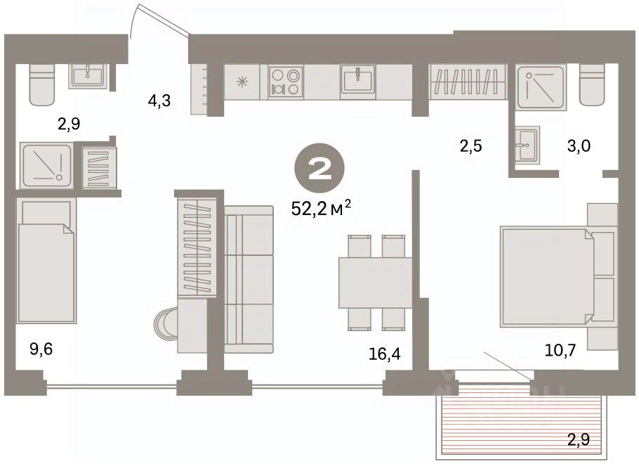 Квартира с кухней-гостиной и двумя спальнями в квартале ''Депо''. Особенности планировки: гардеробная, вид во двор, разнесённые спальни, предчистовая отделка, мастер-спальня, балкон. квартиры в нашей базе: ДЕП07-Ж2.3.6.
