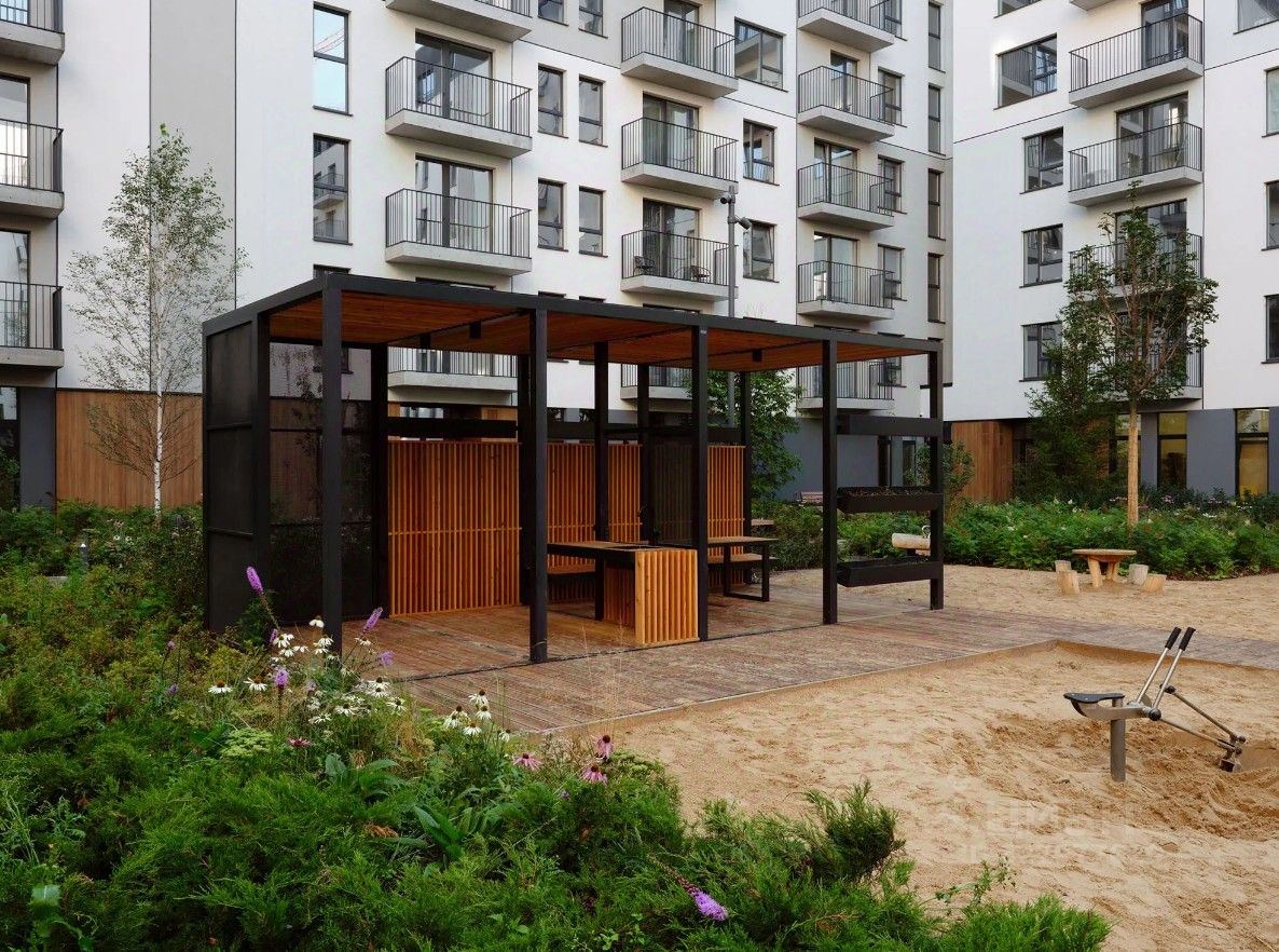 Благоустройство квартала основано на трёх принципах. Первый — особое внимание к воде. Архитекторы Брусники создадут внутри застройки систему дождевых садов, которые будут фильтровать сток (в том числе с крыш зданий) и снижать нагрузку на ливневую канализацию .