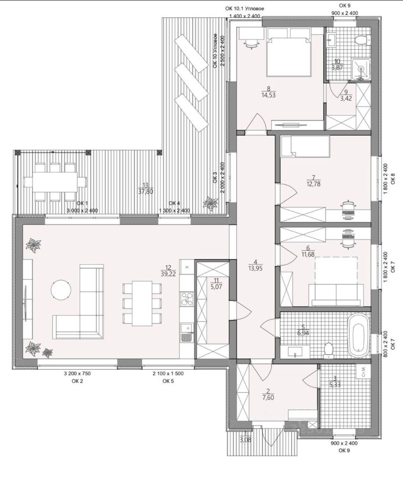 Идеальная форма: T-образная архитектура позволяет зонировать пространство с максимальной эффективностью. Общие зоны отделены от приватных спален, обеспечивая покой и уединение. Стиль и свет: Панорамные немецкие окна от пола до потолка наполняют пространство светом и стирают границу между интерьером и ухоженным садом. Жизнь на террасе: Целых три выхода на просторную террасу! Утро с кофе, вечерние посиделки с друзьями или отдых в одиночестве — терраса станет вторым сердцем дома.