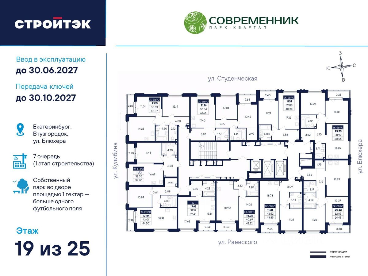 Время жить счастливо Современник — знаковый парк-квартал в интеллигентном районе Втузгородок, откуда недалеко до центра, а вблизи ведущие вузы и театры. Квартал состоит из 8 очередей строительства. Шесть очередей уже сданы и заселены, седьмая строится. В продаже квартиры от застройщика: 1 этап строящейся 7-й очереди. Объединяет квартал большой внутренний парк площадью в гектар — богатый прогулочными маршрутами, тенистыми деревьями, пространствами для отдыха, спорта и детских игр. С внешней стороны, у домов седьмой очереди, появится гостевой центр. Проект создавали в KCAP Architects and Planners, архитектурном бюро из Нидерландов, чьи работы украшают ландшафты Гамбурга, Роттердама, Антверпена и других городов Европы. Современные технологии, продуманное пространство и трендовый облик зданий создают размеренную и счастливую атмосферу для жизни здесь. Достойное окружение До проспекта Ленина на машине вы доберётесь за 10 минут, а с другой стороны, неподалёку — Шарташский лесопарк с озером Шарташ, которому около миллиона лет. Здесь для вас пляжи, лодочные станции, тропы для бега, спортивные площадки и кафе. В квартале уже работают супермаркеты, пекарни, салон красоты и не только. Ближние школы, гимназии и университеты помогут расправить крылья новым поколениям, а детские сады станут заботливой средой в начале пути. Кстати, на территории квартала спроектирован муниципальный детский сад на 200 мест. Выходите во двор Гуляйте по зелёным аллеям или устройтесь с книгой в гамаке. Займитесь воркаутом, футболом, баскетболом или пинг-понгом. Проводите семейные праздники под крытым амфитеатром или отправьте детей весело играть на насыщенный плейхаб. Мы всё предусмотрели. На закрытой территории без машин и посторонних спокойно и безопасно. Видеонаблюдение и освещение добавляют ещё больше уверенности. Впечатляющая доминанта у домов 7 очереди — новый гостевой центр: камерное пространство под навесом-перголой с озеленением и скамейками, чтобы встречать друзей или просто коротать вечер. Ваша зона комфорта Стильное лобби Современника мы выполним в эстетике contemporary: минимализм, сочетание дерева со штукатуркой и тёмным металлом, зеркала, витражи. Обстановка из мягкой мебели, растений и книг. Двери из холла выходят на обе стороны. Внутри — специальная комната для колясок и самокатов. На минус первом этаже подземный паркинг с 201 машино-местом, куда легко попасть на лифте прямо с вашего этажа. Здесь же можно приобрести одну из 67 кладовых, чтобы хранить сезонный инвентарь и крупную технику. СТРОЙТЭК возводит 7 очередь в 3 этапа. Дом с привилегиями Первый этап — секция 7.1, отдельная башня в 25 этажей. Здесь 246 квартир в 19 уникальных планировках от студий до 3-комнатных, в классических и евро-вариантах. Просторные кухни-гостиные, гардеробные и окна на 2 стороны — лишь часть их плюсов. В Современнике улучшенный стандарт отделки ''Комфорт +''. Помимо привычных комфортных сантехники и электрики, в него входят оконные стёкла Energy Light, которые помогают сохранять комфорт