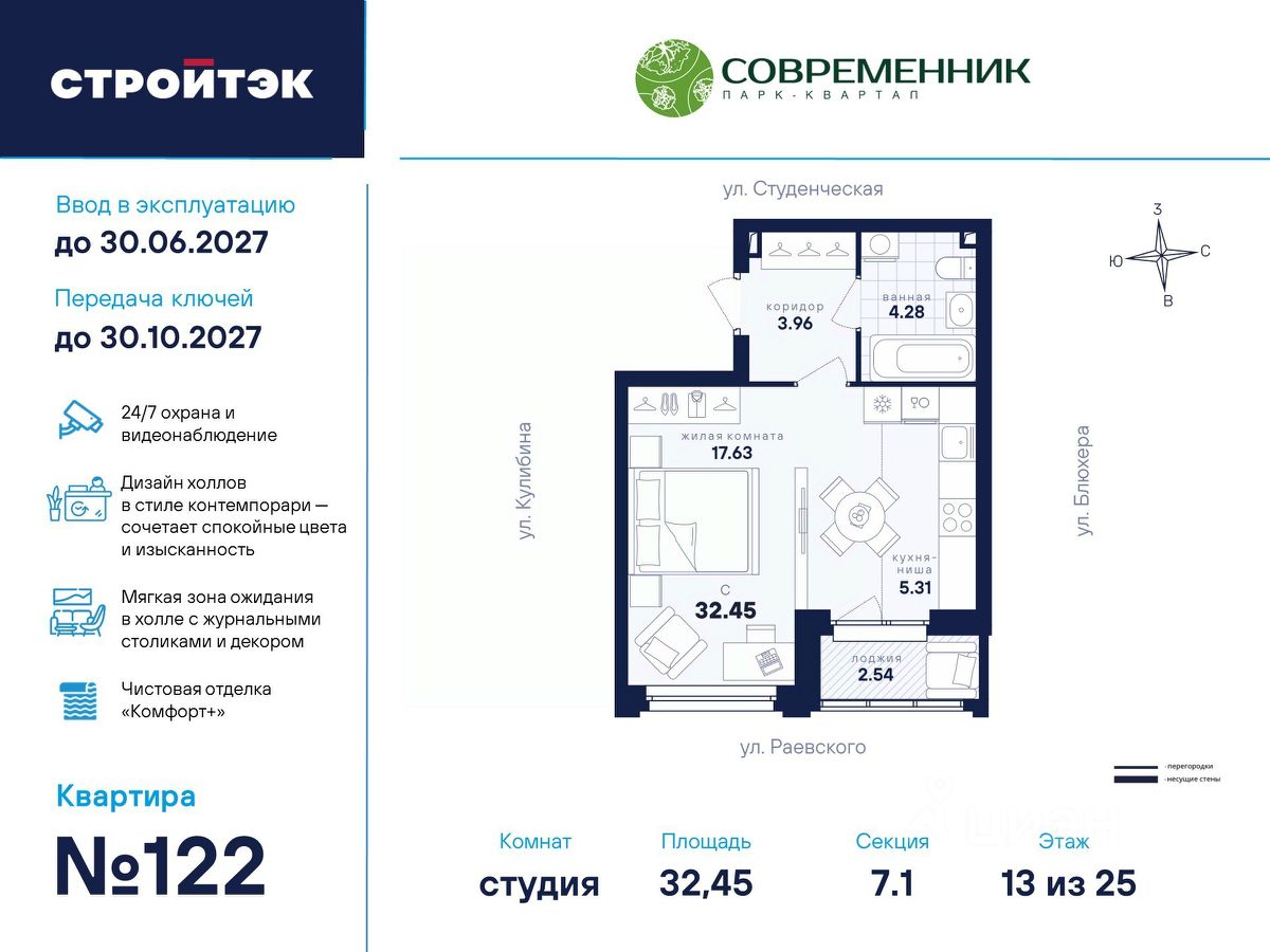 Время жить счастливо Современник — знаковый парк-квартал в интеллигентном районе Втузгородок, откуда недалеко до центра, а вблизи ведущие вузы и театры. Квартал состоит из 8 очередей строительства. Шесть очередей уже сданы и заселены, седьмая строится. В продаже квартиры от застройщика: 1 этап строящейся 7-й очереди. Объединяет квартал большой внутренний парк площадью в гектар — богатый прогулочными маршрутами, тенистыми деревьями, пространствами для отдыха, спорта и детских игр. С внешней стороны, у домов седьмой очереди, появится гостевой центр. Проект создавали в KCAP Architects and Planners, архитектурном бюро из Нидерландов, чьи работы украшают ландшафты Гамбурга, Роттердама, Антверпена и других городов Европы. Современные технологии, продуманное пространство и трендовый облик зданий создают размеренную и счастливую атмосферу для жизни здесь. Достойное окружение До проспекта Ленина на машине вы доберётесь за 10 минут, а с другой стороны, неподалёку — Шарташский лесопарк с озером Шарташ, которому около миллиона лет. Здесь для вас пляжи, лодочные станции, тропы для бега, спортивные площадки и кафе. В квартале уже работают супермаркеты, пекарни, салон красоты и не только. Ближние школы, гимназии и университеты помогут расправить крылья новым поколениям, а детские сады станут заботливой средой в начале пути. Кстати, на территории квартала спроектирован муниципальный детский сад на 200 мест. Выходите во двор Гуляйте по зелёным аллеям или устройтесь с книгой в гамаке. Займитесь воркаутом, футболом, баскетболом или пинг-понгом. Проводите семейные праздники под крытым амфитеатром или отправьте детей весело играть на насыщенный плейхаб. Мы всё предусмотрели. На закрытой территории без машин и посторонних спокойно и безопасно. Видеонаблюдение и освещение добавляют ещё больше уверенности. Впечатляющая доминанта у домов 7 очереди — новый гостевой центр: камерное пространство под навесом-перголой с озеленением и скамейками, чтобы встречать друзей или просто коротать вечер. Ваша зона комфорта Стильное лобби Современника мы выполним в эстетике contemporary: минимализм, сочетание дерева со штукатуркой и тёмным металлом, зеркала, витражи. Обстановка из мягкой мебели, растений и книг. Двери из холла выходят на обе стороны. Внутри — специальная комната для колясок и самокатов. На минус первом этаже подземный паркинг с 201 машино-местом, куда легко попасть на лифте прямо с вашего этажа. Здесь же можно приобрести одну из 67 кладовых, чтобы хранить сезонный инвентарь и крупную технику. СТРОЙТЭК возводит 7 очередь в 3 этапа. Дом с привилегиями Первый этап — секция 7.1, отдельная башня в 25 этажей. Здесь 246 квартир в 19 уникальных планировках от студий до 3-комнатных, в классических и евро-вариантах. Просторные кухни-гостиные, гардеробные и окна на 2 стороны — лишь часть их плюсов. В Современнике улучшенный стандарт отделки ''Комфорт +''. Помимо привычных комфортных сантехники и электрики, в него входят оконные стёкла Energy Light, которые помогают сохранять комфорт