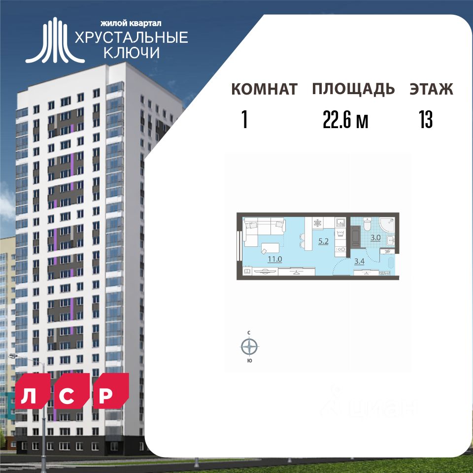 Квартира располагается на 13 этаже 25-этажного дома в ЖК Хрустальные Ключи. Застройщик - ЛСР, сдача дома - IV квартал 2025 года, высота потолков 2.5 м. Парковка автомобилей - наземная. Инфраструктура: школа, детский сад, детские площадки, спортивные площадки, супермаркет.