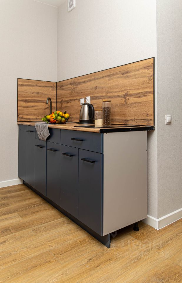 - Совмещенная кухонная зона с новой мебелью, холодильником, варочной панелью, чайником и микроволновой печью.