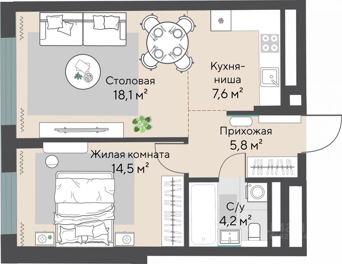 Продаётся 1-комнатная квартира в строящемся доме (Секции 2.3-2.4), срок сдачи: I-кв. 2028, общей площадью 50.1 кв.м., на 8 этаже.
