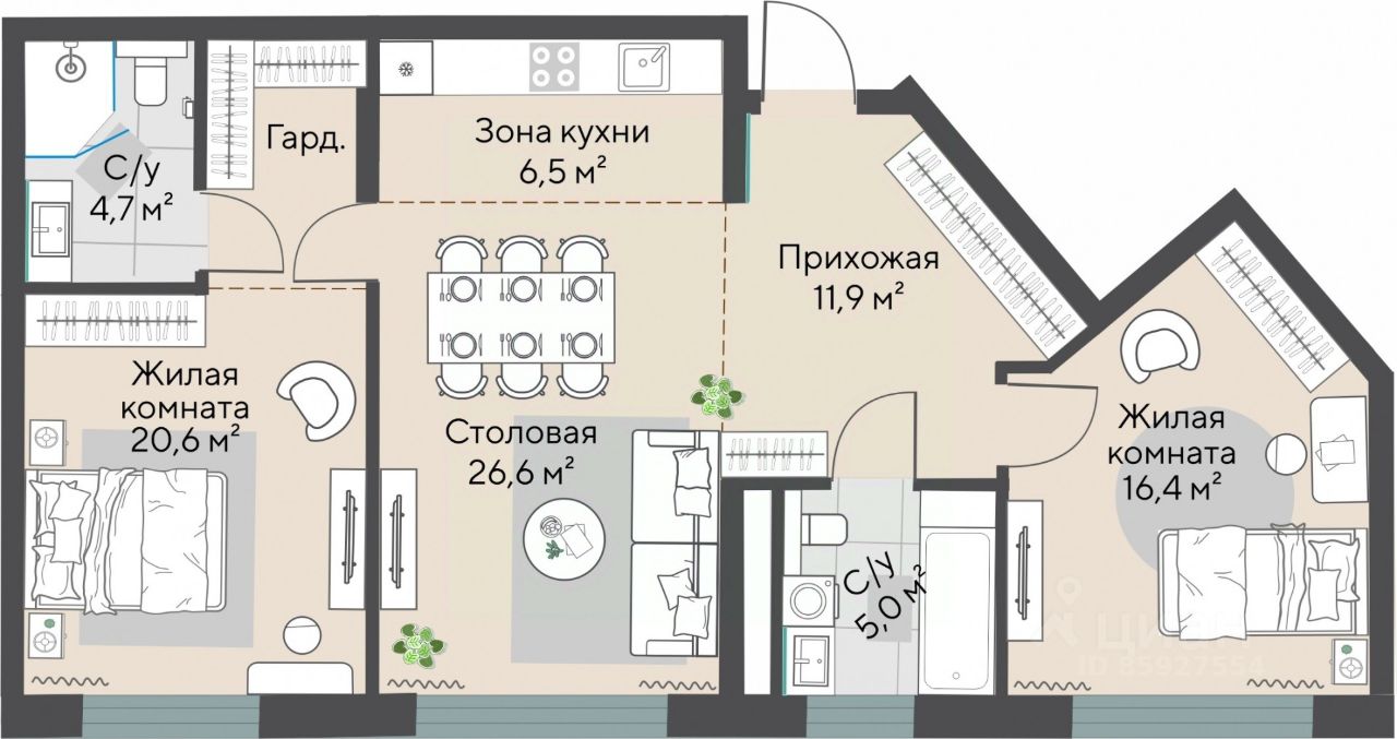 Продаётся 2-комнатная квартира в строящемся доме (Секции 2.3-2.4), срок сдачи: I-кв. 2028, общей площадью 85.2 кв.м., на 8 этаже.