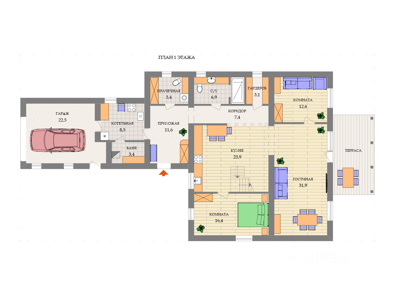 Внутреннее пространство дома: • Зал, кухня-гостиная, три спальни, игровая. • Сделан качественный ремонт: глянцевые натяжные потолки, декоративная штукатурка, теплый пол, стеклопакеты. • Зал с панорамным остеклением.