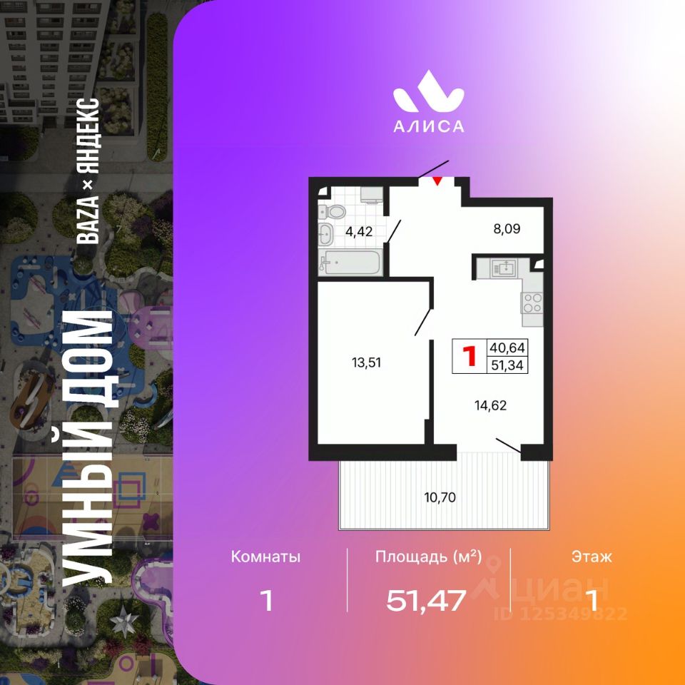 Продается 1-комн. квартира с предчистовой отделкой в ЖК ''Алиса'' на 1 этаже. Общая площадь: 51.47 кв.м., жилая: 13.51 кв.м., площадь просторной кухни-столовой: 14.62 кв.м. Все окна выходят на одну сторону. В квартире один балкон, один совмещенный санузел. Терраса представляет собой роскошную зону отдыха, где вы на свой вкус можете создать атмосферу комфорта и уюта. Высота потолков 2.72 м.