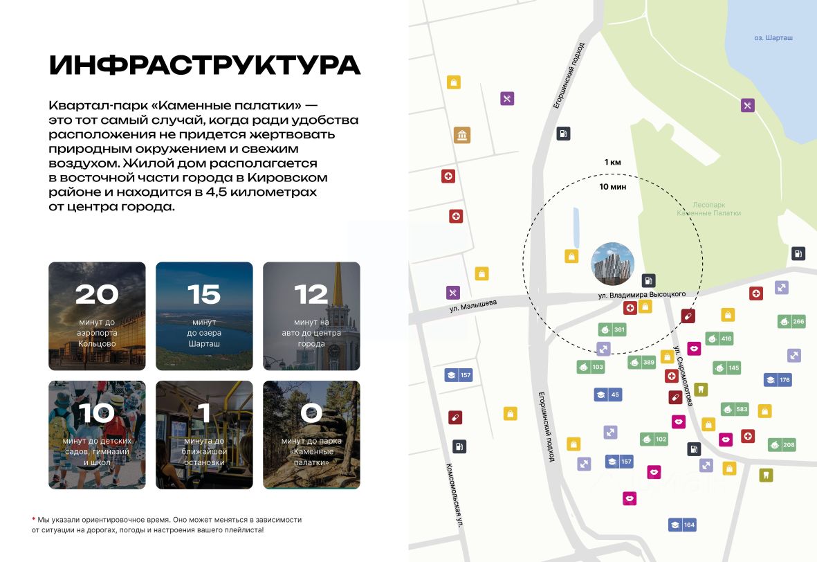 - Лесопарк ''Каменные палатки'' и озеро ''Шарташ'' в шаговой доступности. - Закрытая территория с собственным выходом в лес. Стилобат с объектами социальной и бытовой инфраструктуры, а также несколько детских площадок. - Собственный детский сад на 200 мест во дворе. - Видеонаблюдение, охрана. Вход только по смарт-ключам. - Комьюнити центр - бесплатное пространство для совместной работы, общения и отдыха прямо в доме. - Управляющая компания от BAZA. Мероприятия для жителей, собственное приложение для дистанционного решения вопросов, регулярные собрания и сбор обратной связи, офис прямо в доме для оперативного решения вопросов. - Трехступенчатая система дополнительной очистки воды.