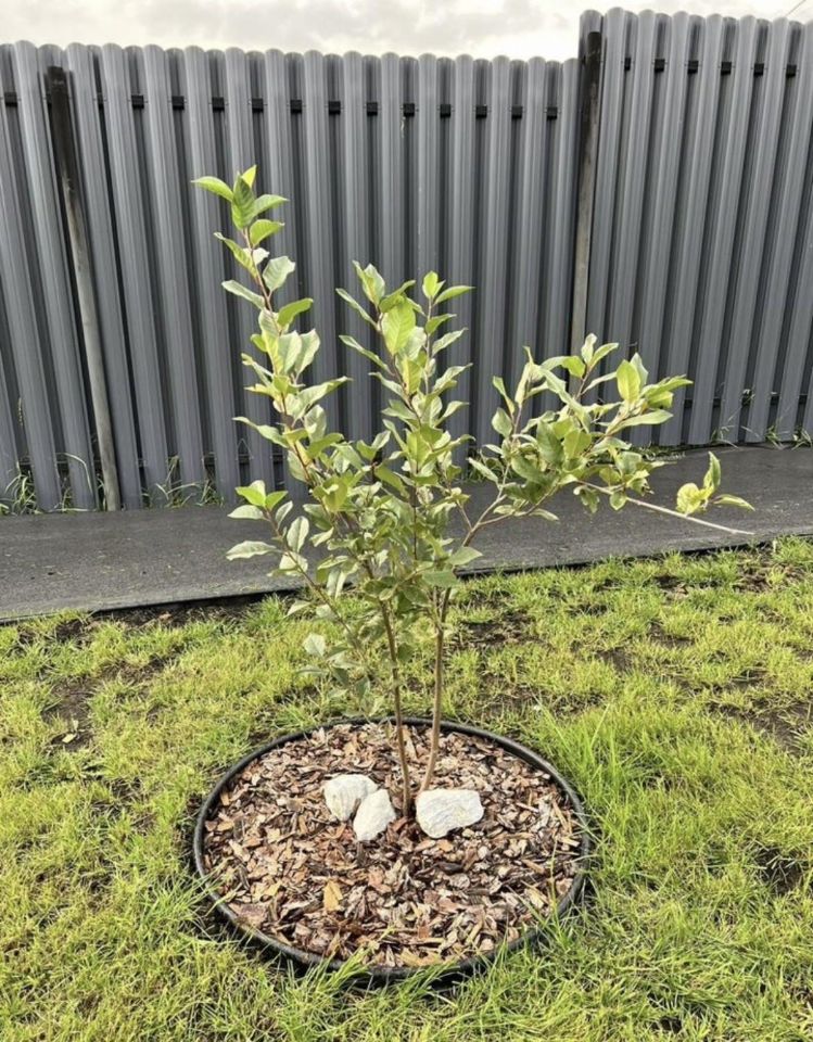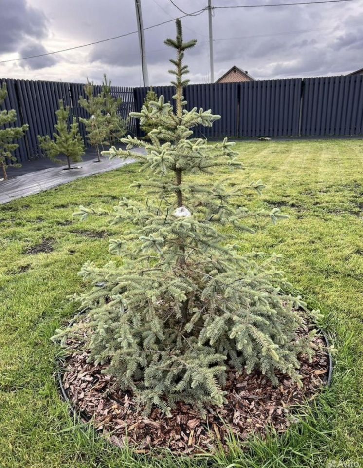 Растения с газоном, соснами и голубой елью, мангал с крышей.