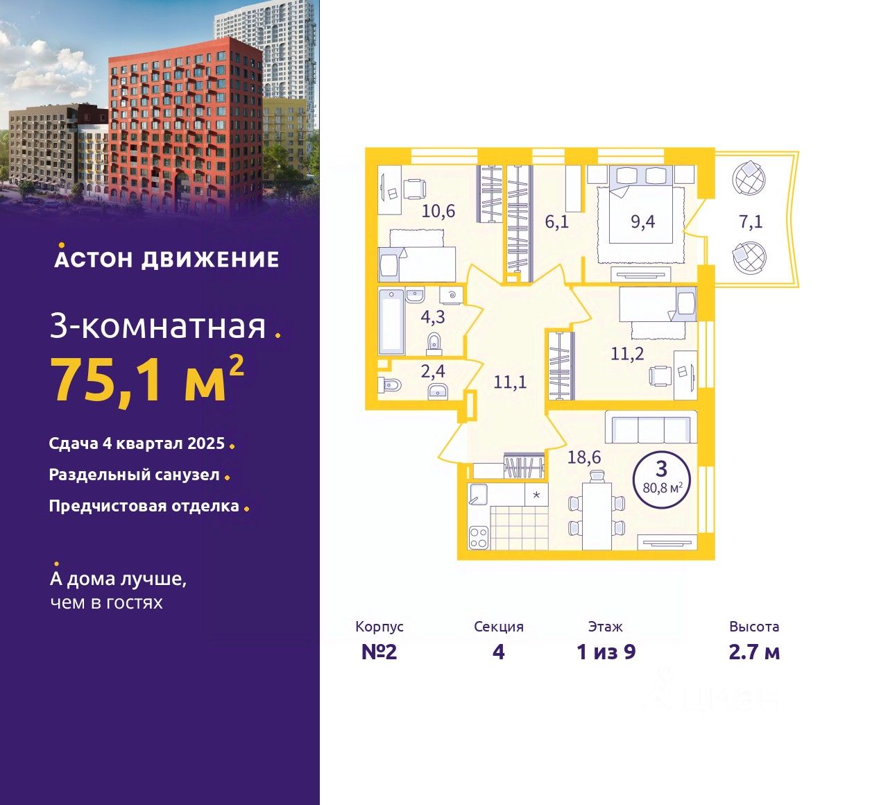 Трехкомнатная квартира от застройщика с предчистовой отделкой в ЖК ''Астон.Движение'' на 1 этаже. Общая площадь: 75.1 кв.м. Высота потолков 2.7 м.