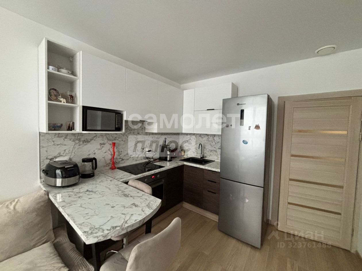 Просторная кухня с новым, современным гарнитуром оснащена всей встроенной техникой: варочная панель, духовой шкаф, вытяжка, посудомоечная машина, а так же есть микроволновка и холодильник. Две изолированные комнаты правильной формы, включая спальню с выходом на лоджией. Теплый дом и отличная шумоизоляция в доме.