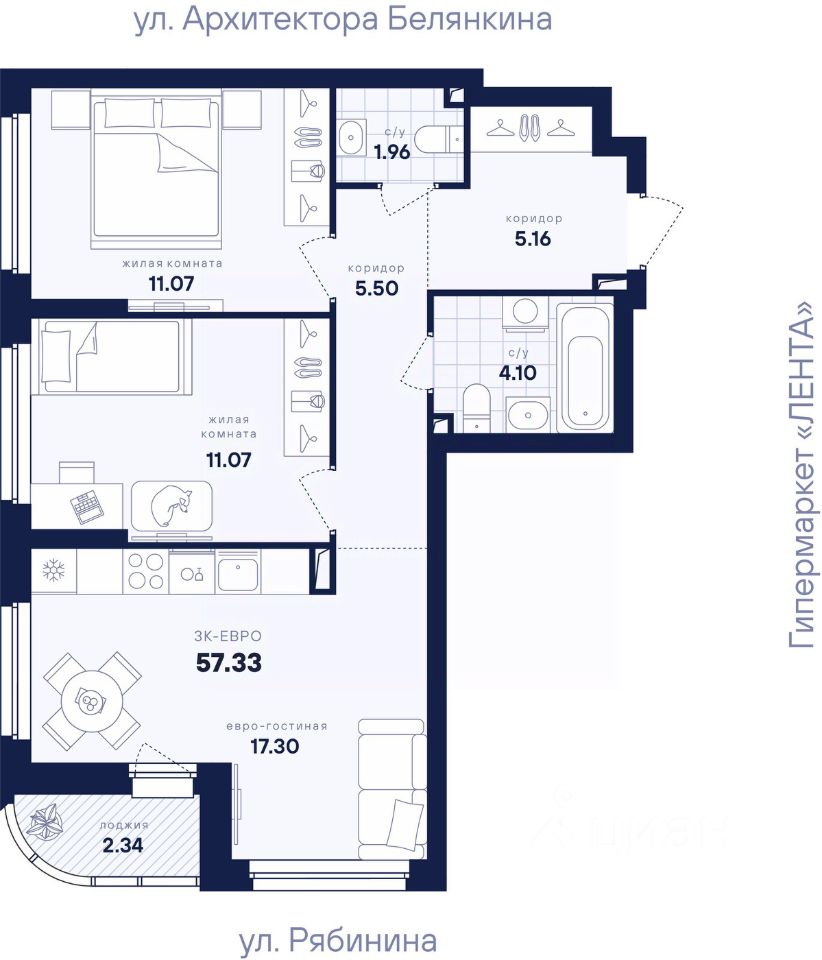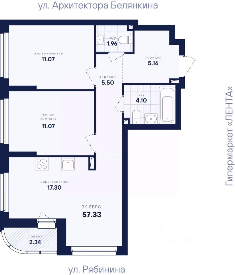 Общая площадь57,33 м2