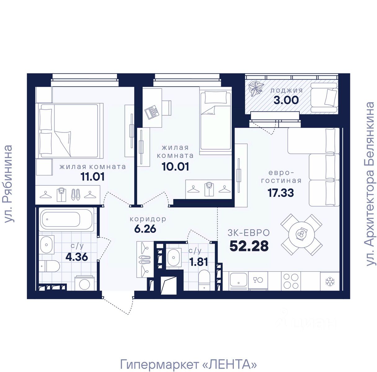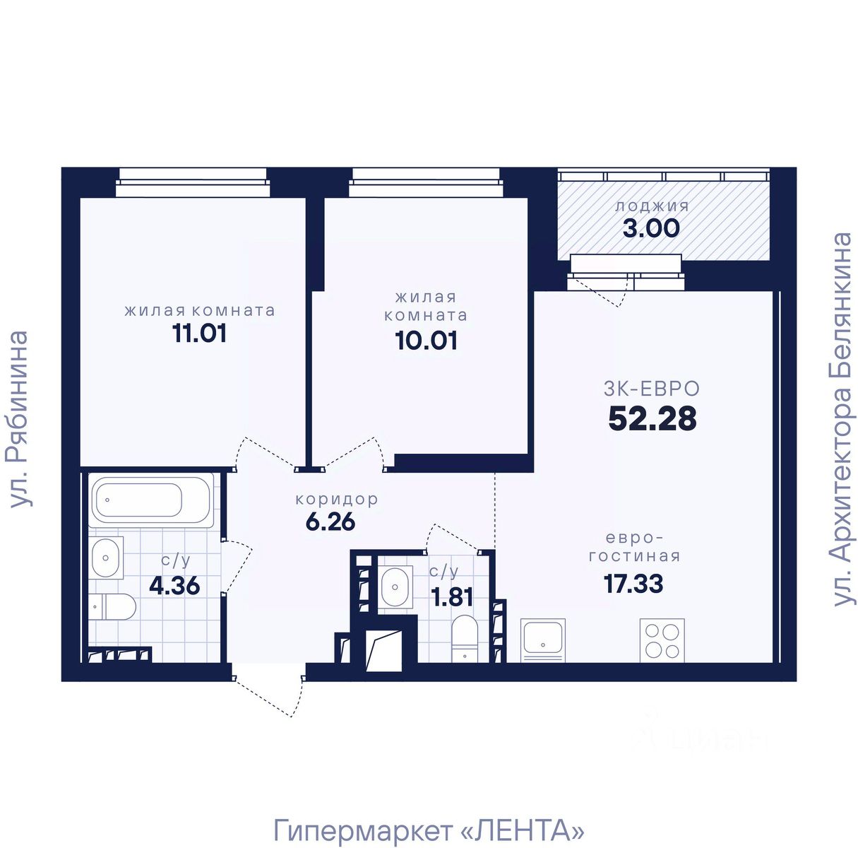 Общая площадь52,28 м2