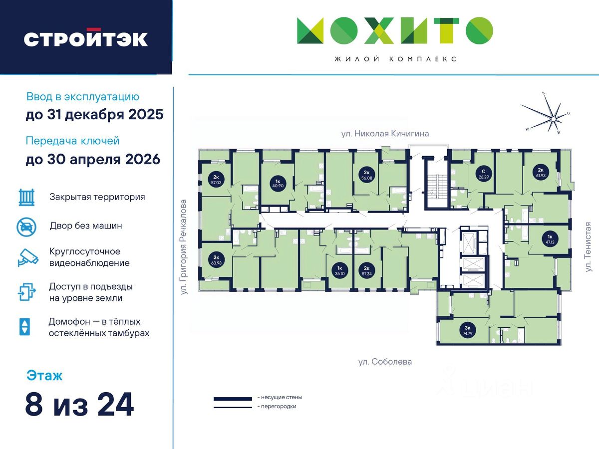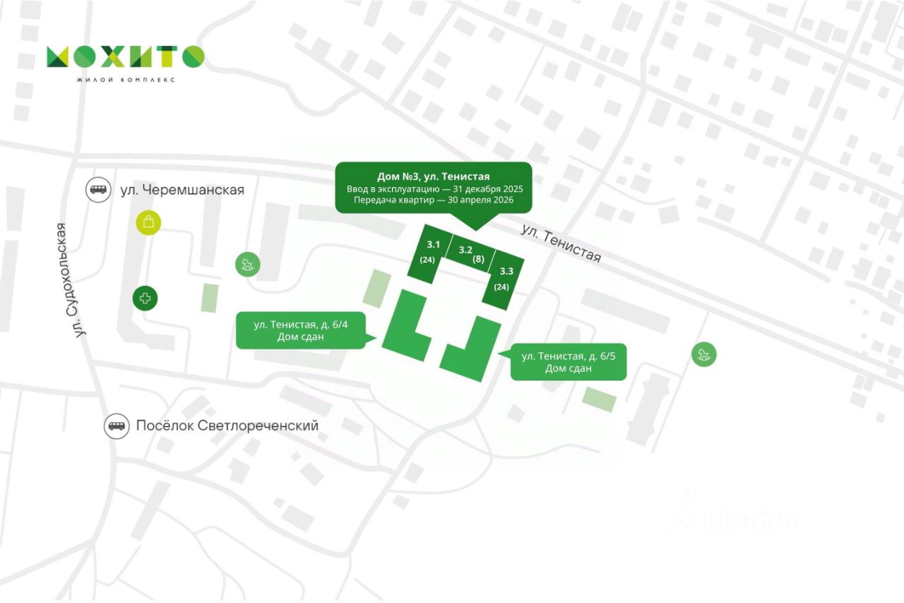 ЖК ''Мохито'' — это квартал комфорт-класса, уютно расположенный в границах улиц Тенистая Григория Речкалова Николая Кичигина. Первая очередь ЖК ''Мохито'' уже заселена, а вторая будет сдана в эксплуатацию до конца декабря 2025 года. Вторая очередь строительства дополняет и завершает облик ЖК. Дом состоит из двух секций в 24 этажа, которые объединяет между собой 8-этажный модуль. На первом этаже предусмотрены помещения для офисов. Академический район — один из самых молодых районов города Екатеринбурга. Прогрессивный подход к застройке, широкие улицы, транспортная доступность и богатая инфраструктура привлекает сюда новосёлов.