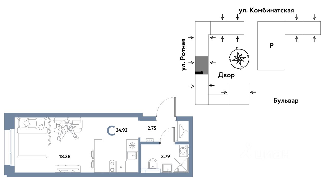 0комнатная квартира площадью 24,92кв. м. на 3 этаже жилого комплекса ''Уральский сад''.
