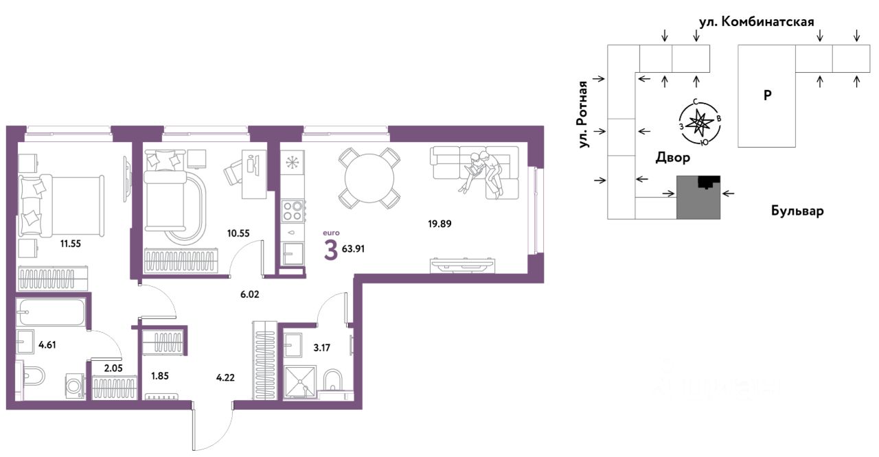 3комнатная квартира площадью 63,91кв. м. на 3 этаже жилого комплекса ''Уральский сад''.