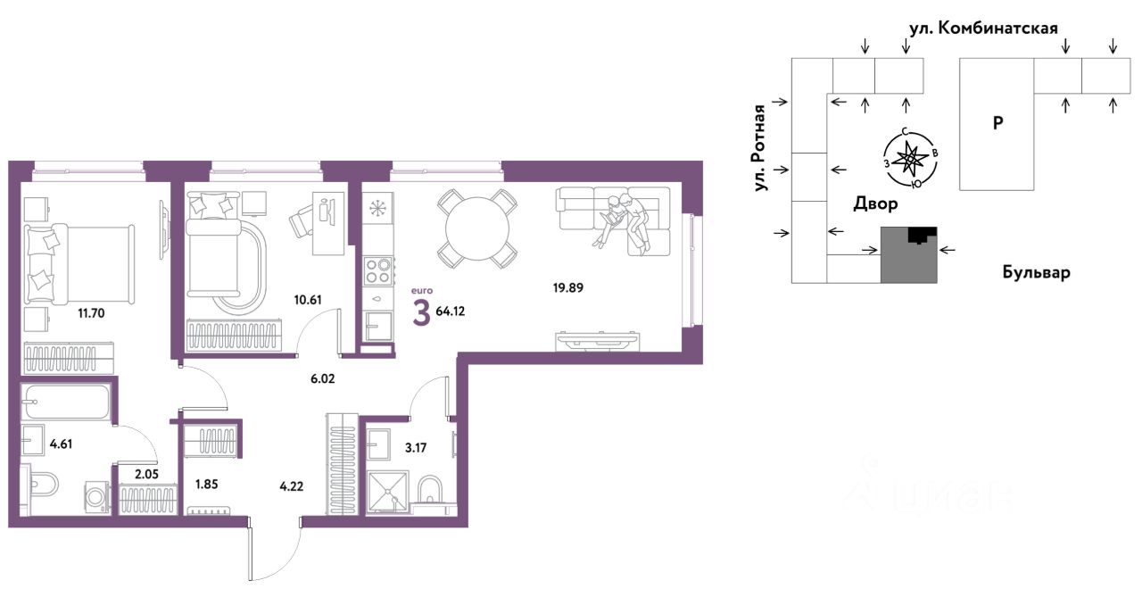 3комнатная квартира площадью 64,12кв. м. на 5 этаже жилого комплекса ''Уральский сад''.
