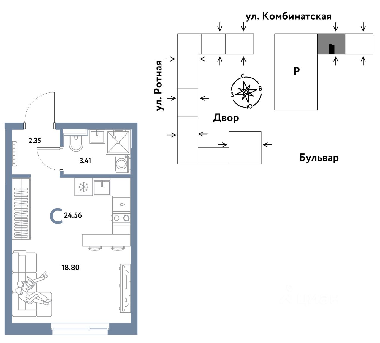 0комнатная квартира площадью 24,56кв. м. на 10 этаже жилого комплекса ''Уральский сад''.