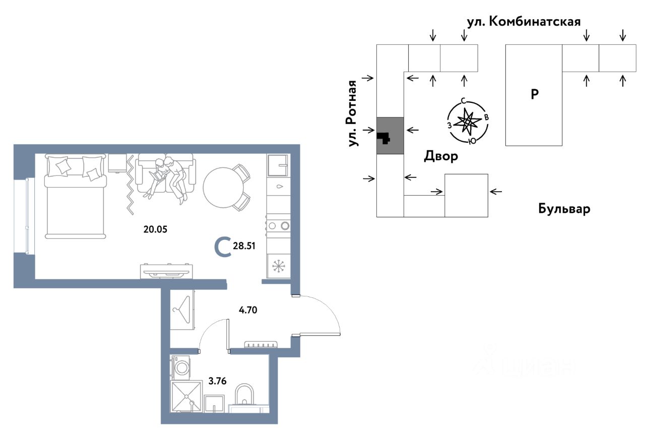 0комнатная квартира площадью 28,51кв. м. на 4 этаже жилого комплекса ''Уральский сад''.