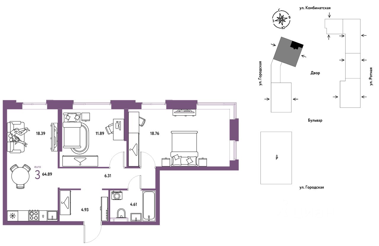 3комнатная квартира площадью 64,89кв. м. на 15 этаже жилого комплекса ''Уральский сад''.