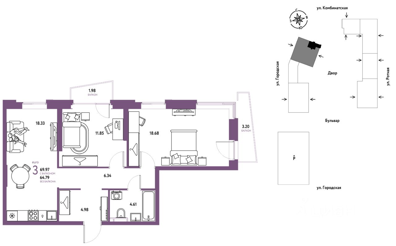 3комнатная квартира площадью 69,97кв. м. на 7 этаже жилого комплекса ''Уральский сад''.