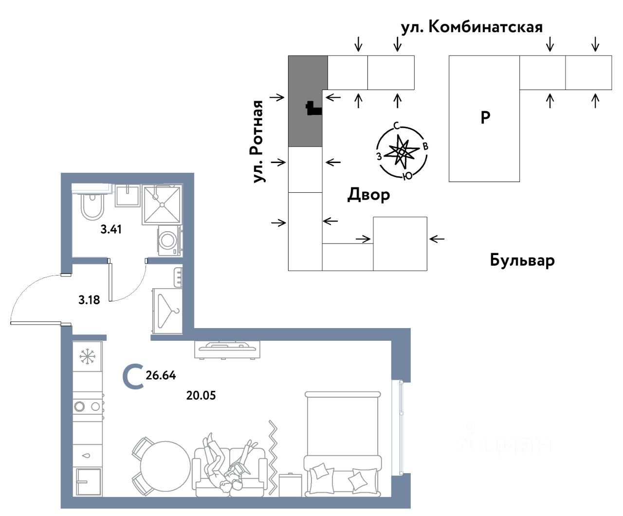 0комнатная квартира площадью 26,64кв. м. на 5 этаже жилого комплекса ''Уральский сад''.
