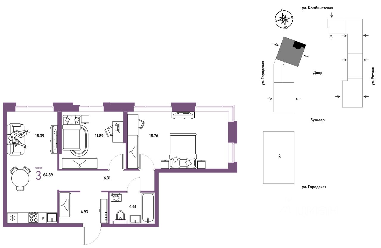 3комнатная квартира площадью 64,89кв. м. на 14 этаже жилого комплекса ''Уральский сад''.