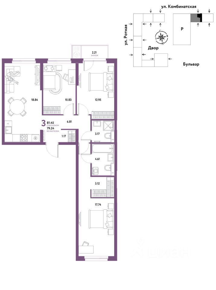 3комнатная квартира площадью 81,45кв. м. на 6 этаже жилого комплекса ''Уральский сад''.
