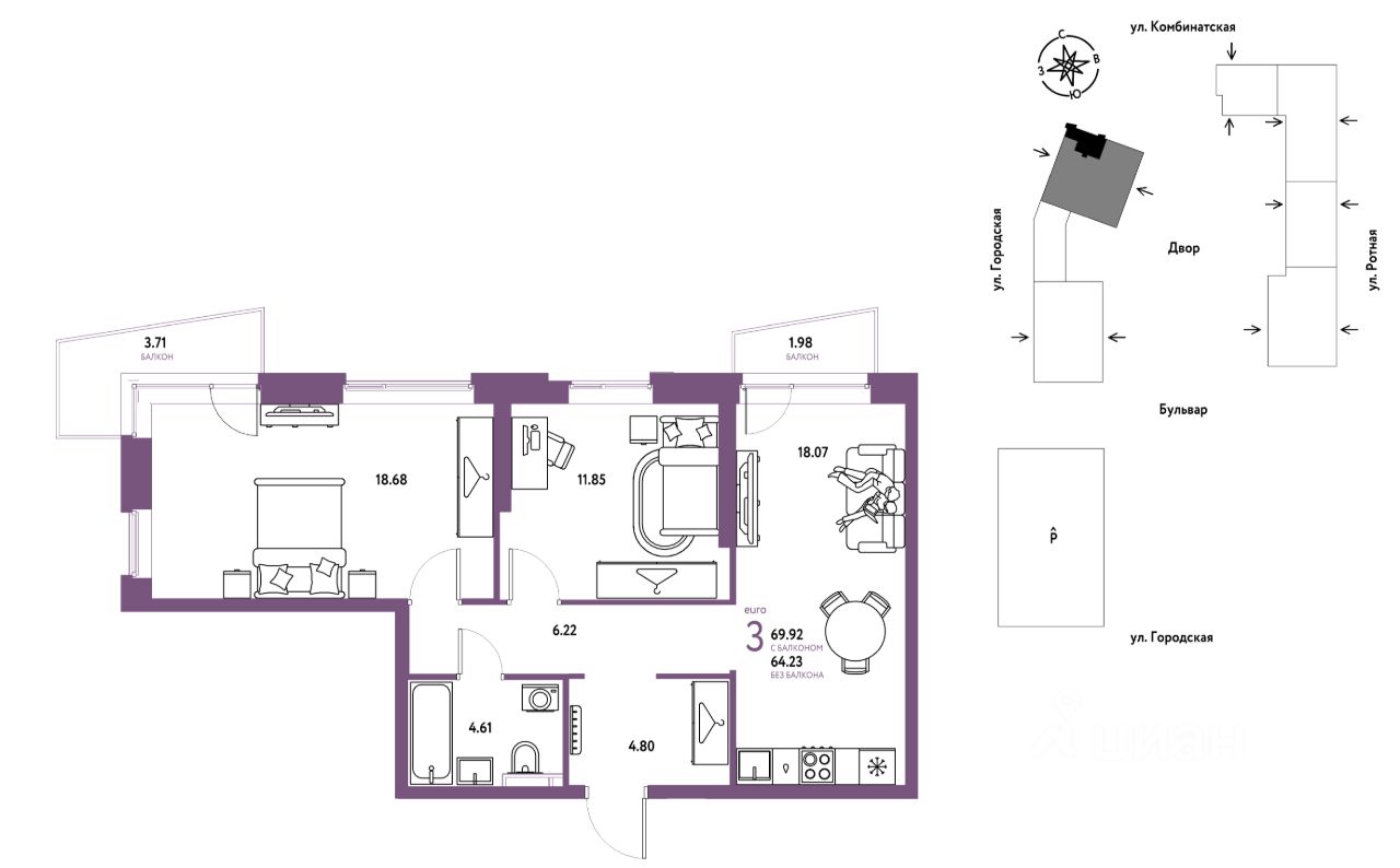 3комнатная квартира площадью 69,92кв. м. на 5 этаже жилого комплекса ''Уральский сад''.