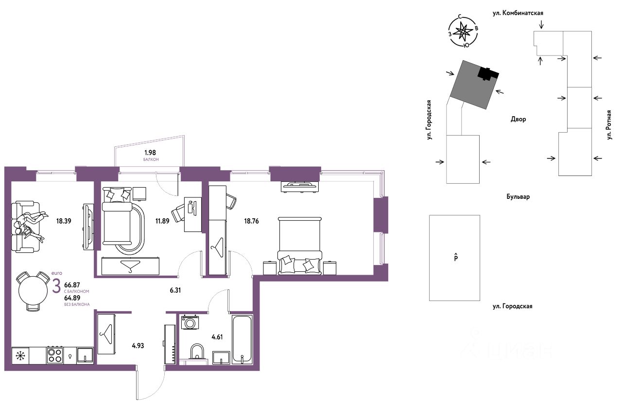 3комнатная квартира площадью 66,87кв. м. на 11 этаже жилого комплекса ''Уральский сад''.