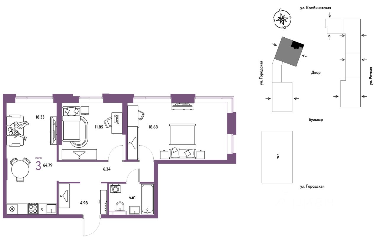 3комнатная квартира площадью 64,79кв. м. на 8 этаже жилого комплекса ''Уральский сад''.