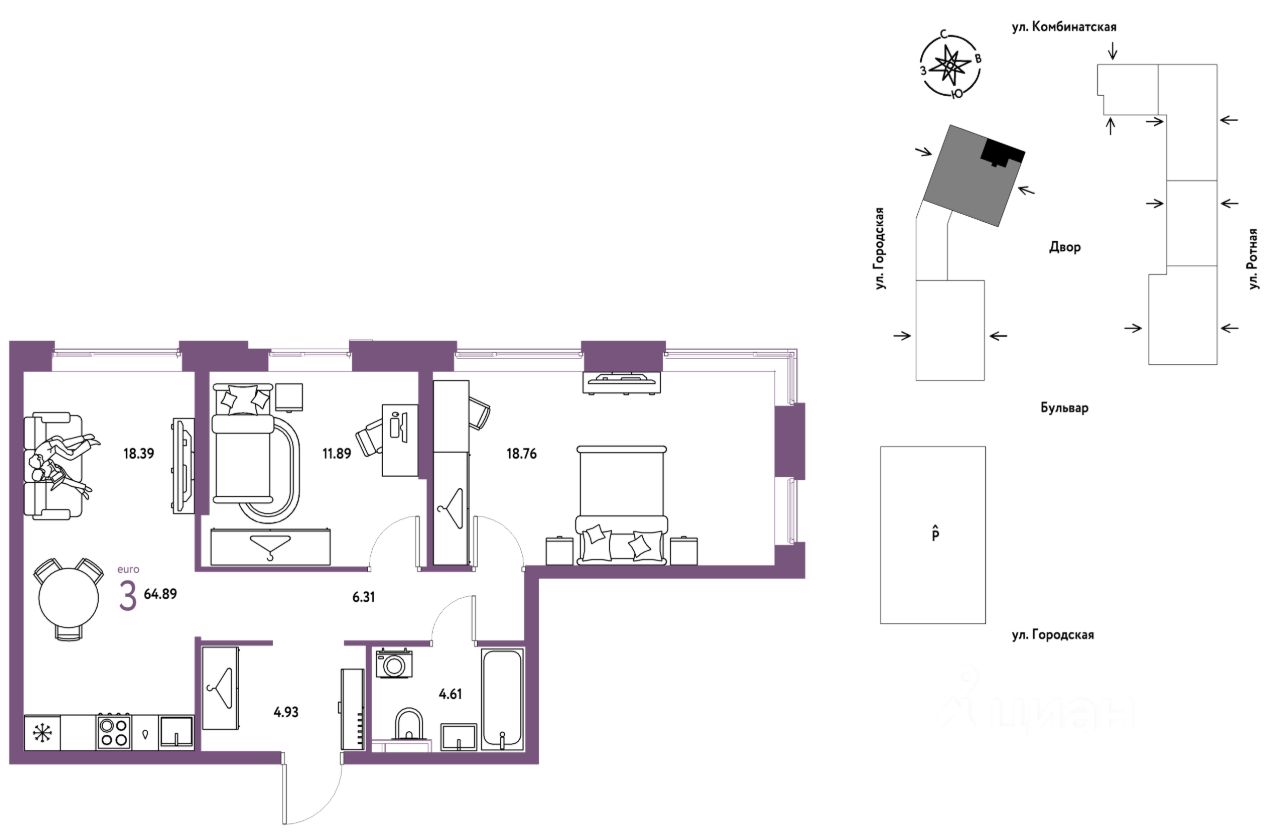 3комнатная квартира площадью 64,89кв. м. на 20 этаже жилого комплекса ''Уральский сад''.