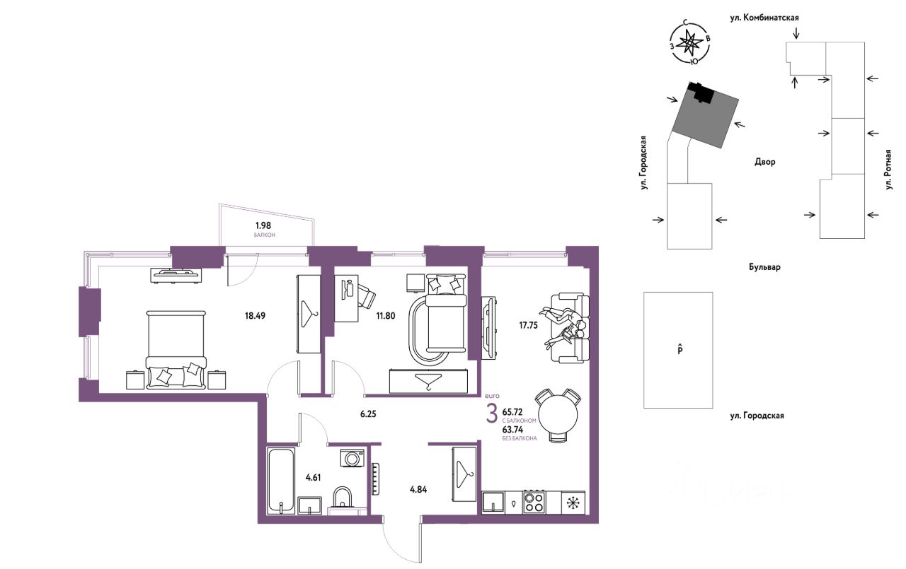 3комнатная квартира площадью 65,72кв. м. на 3 этаже жилого комплекса ''Уральский сад''.
