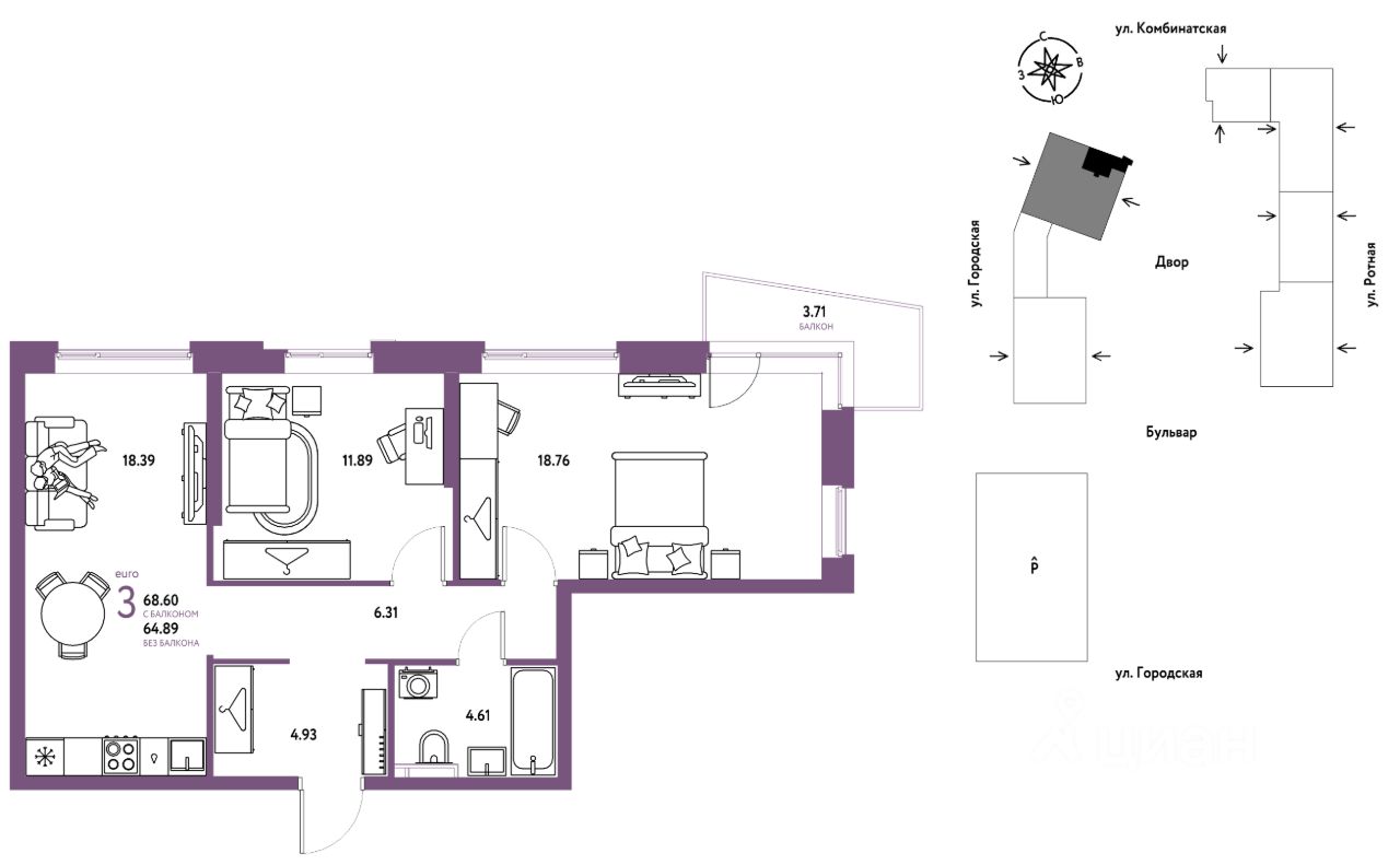 3комнатная квартира площадью 68,6кв. м. на 18 этаже жилого комплекса ''Уральский сад''.