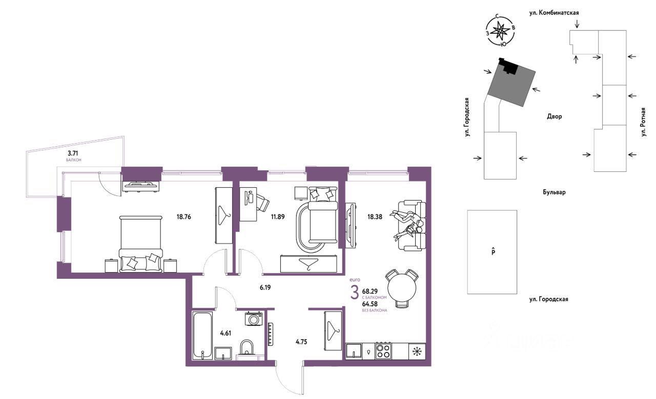 3комнатная квартира площадью 68,29кв. м. на 19 этаже жилого комплекса ''Уральский сад''.